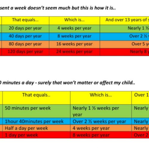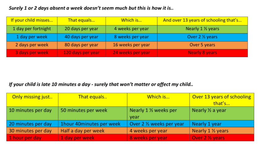 Thank you to the many parents who ensure that their children attend regularly and arrive in time. The following information does not affect most families but we would like to highlight the effects of late arrival and/or non-attendance.